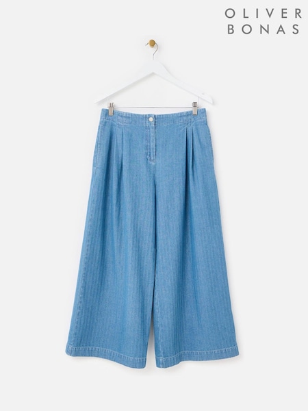 Oliver Bonas Blue Denim Pleat Waist Cropped Wide Leg Jeans
