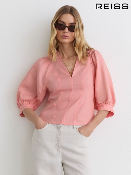 Reiss Coral Pink Evie Linen Balloon-Sleeve Top