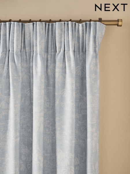Blue Toile Print Touch Of Linen Pencil Pleat Lined Curtains