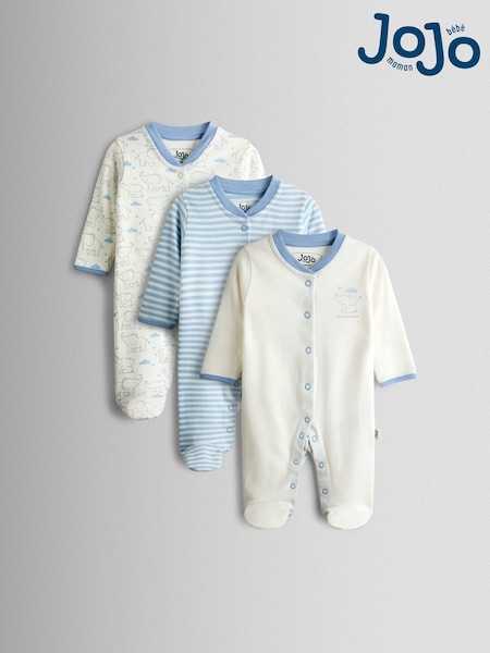 JoJo Maman Bébé Blue Elephant Cotton Footed 3 Pack Sleepsuit