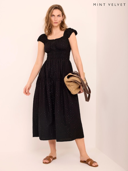 Mint Velvet Black Cotton Blend Textured Midi Dress