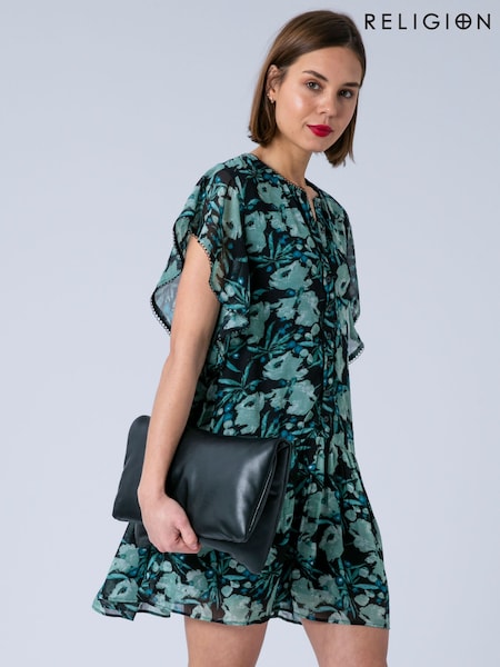 Religion Green Diana Tunic Dress With Neck Tie In Dark Floral Placement Print