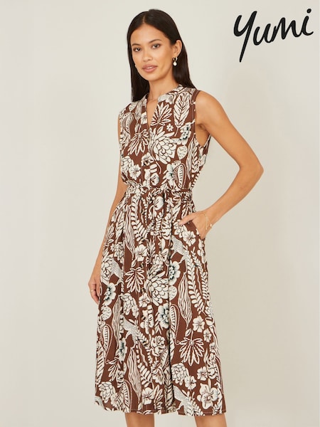 Yumi Brown Leaf Print Shirt Dress