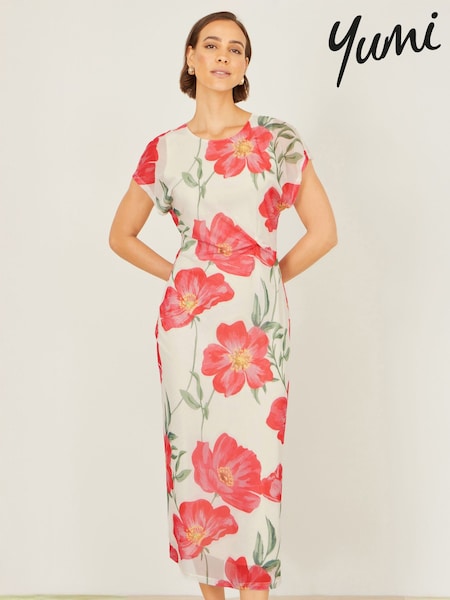 Yumi Cream Floral Wrap Dress With Dipped Hem