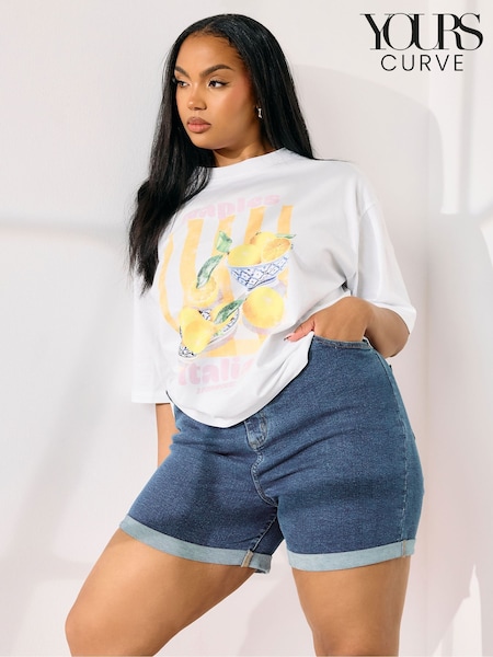 Yours Curve Blue Elasticated Waist Turn Up Denim Shorts