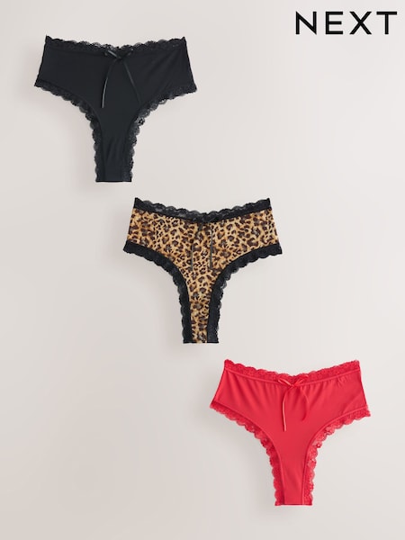 Black/Animal/Red High Waisted Thong Microfibre And Lace Knickers 3 Pack