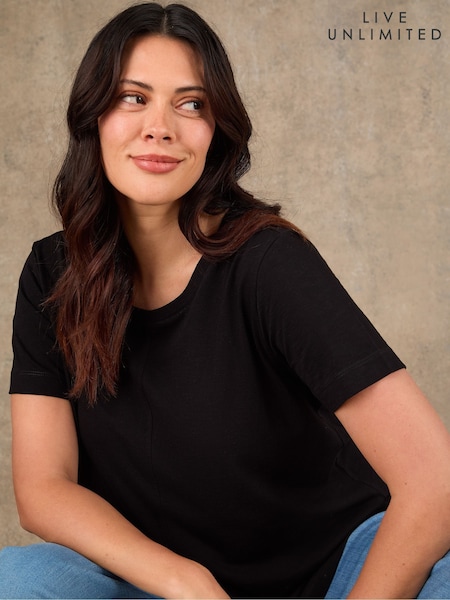Live Unlimited Black Cotton Slub Round Neck Seam Detail T-Shirt