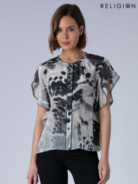 Religion Grey Hidden Top With Wrap Over Tie Detail In Abstract Stream Print