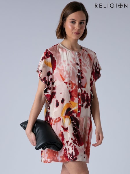 Religion Pink Ara Tunic Dress with Ruffle Sleeves and Lace Trim