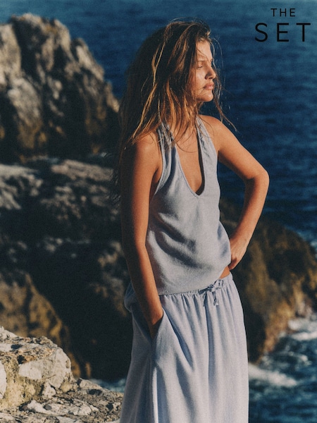 The Set 2 Pack Tie Neck Halter Tops with Linen Blue/White