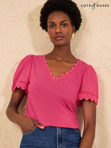 Love & Roses Bright Pink Petite Scallop V-Neck T-Shirt