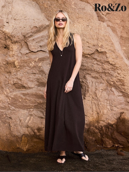 Ro&Zo Brown Slub Jersey V-Neck Midi Dress