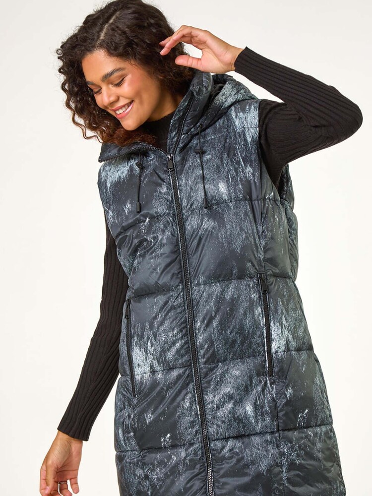 Add a touch of flair to your Autumn Winter wardrobe with our printed longline hooded gilet. Designed with a drawcord hood and funnel neckline to keep you protected from the elements, this sleeveless style features a front full zip and practical pockets for all your essentials. Cut from a smooth wadded fabric, this gilet falls in a flattering longline shape, making it the perfect layering piece. Simply style over your favourite jumper, team with jeggings and finish with ankle boots for a complete fall look! Regular centre back neck to hem 36" / 91cm. Machine washable. 100% Polyester. Country of Origin: China