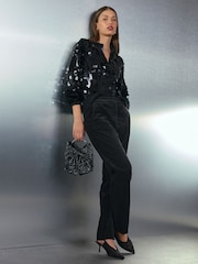 A must-have for the party season, these Black Velvet Straight Leg Trousers are a timeless staple. The velvet fabric gives a luxurious feel, while the straight-leg cut creates a classic silhouette. They are a versatile piece that can be dressed up or down. Side pockets Belt loops Straight leg Regular to fit inside leg 29" / 74cm. Long to fit inside leg 31" / 79cm. Machine washable. 75% Cotton, 23% Modal, 2% Elastane. Country of Origin: Pakistan Items with the curve logo are available in sizes 18 and above.