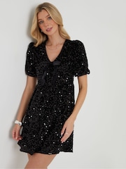 Threadbare Black Sequin Velour Bow Detail Mini Dress