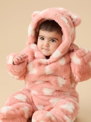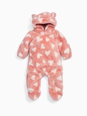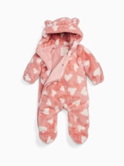 Keep your child warm on chilly outings with this supersoft zip-up pramsuit. Full coverage and soft, snug material make it perfect for winter walks. Machine washable. 100% Polyester. Country of Origin: China
